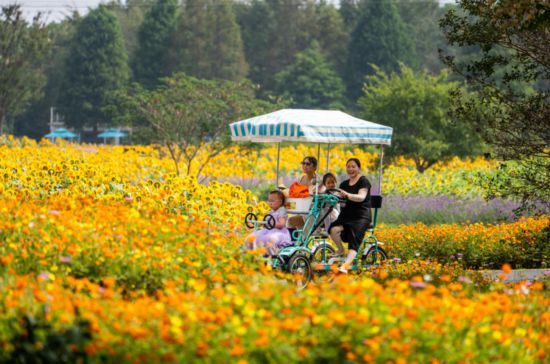 假期里,花开海上生态园内的向日葵、格桑花、百日菊等花卉也正值盛花期,五彩斑斓的花海成为秋日里的一道靓丽风景线。景区以花为媒,以活动为线,打造一场由自然花海、田园音乐会、非遗市集共同构成的多元假日体验,无论是漫步花海赏景,还是在音乐会中放松身心,亦或在非遗市集感受传统文化,都让游客串联起一段属于自己的秋日专属记忆。
