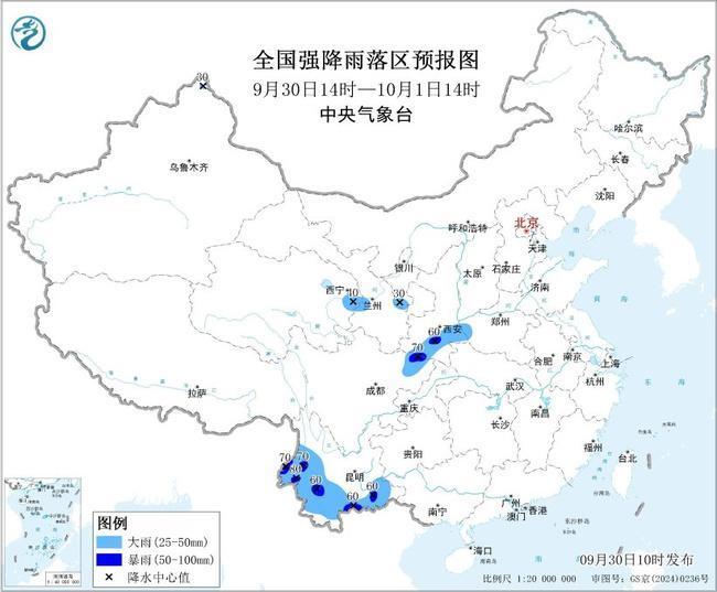 r预计,9月30日14时至10月1日14时,青海东北部、甘肃南部、宁夏南部、陕西南部、四川东北部、河南西部、云南西部和南部等地部分地区有大雨或暴雨(50~80毫米)。上述部分地区伴有短时强降水(最大小时降雨量30~50毫米,局地可超过60毫米),局地有雷暴大风等强对流天气。